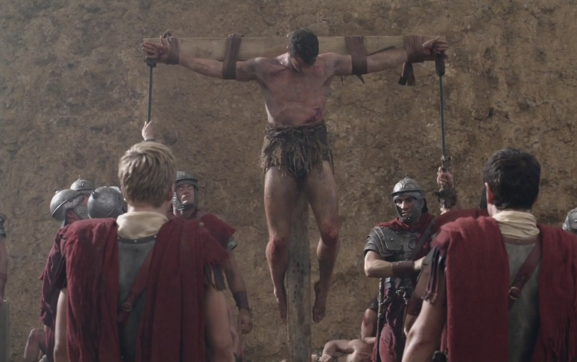 "By the side of the caravan road a heavy cross had been planted, and on this grim tree a man hung, nailed there by iron spikes through his hands and feet. Naked but for a loin-cloth, the man was almost a giant in stature, and his muscles stood out in thick corded ridges on limbs and body, which the sun had long ago burned brown..."